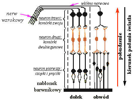 Receptorami wrażliwymi na promienie świetlne - fotoreceptorami - są pręciki i czopki, znajdujące się na zewnętrznej warstwie siatkówki.